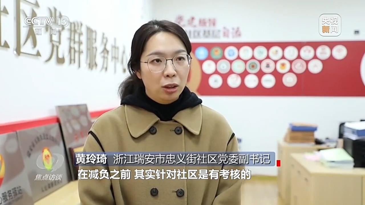 浙江瑞安市忠义街社区党委副书记 黄玲琦:在减负之前,其实针对社区是有考核的,规定我们每个月要开展八场活动,不可能一整个月都在那里办活动不开展日常服务,我只能是有一些活动拿过来凑。要想考核好,只能围绕着考核细则转,没办法。