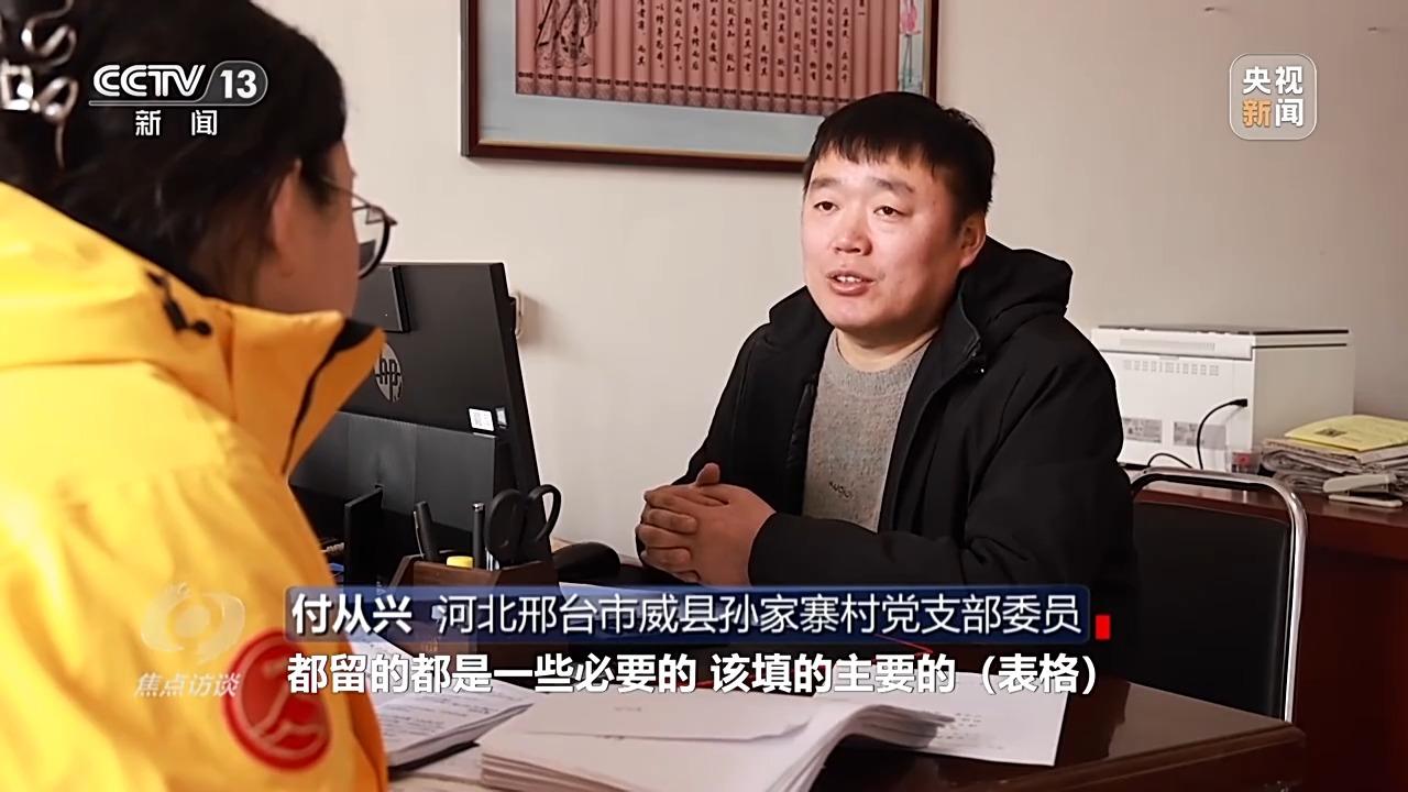 河北邢台市威县孙家寨村党支部委员 付从兴:现在各个部门表格减少了,都留的都是一些必要的、该填的主要的表格,我感觉这样很好,很精简,入户有更多精力去给人家探索这些事情,人家家里确实发生什么困难,有多少收入,咱们的政策怎么能帮助人家。