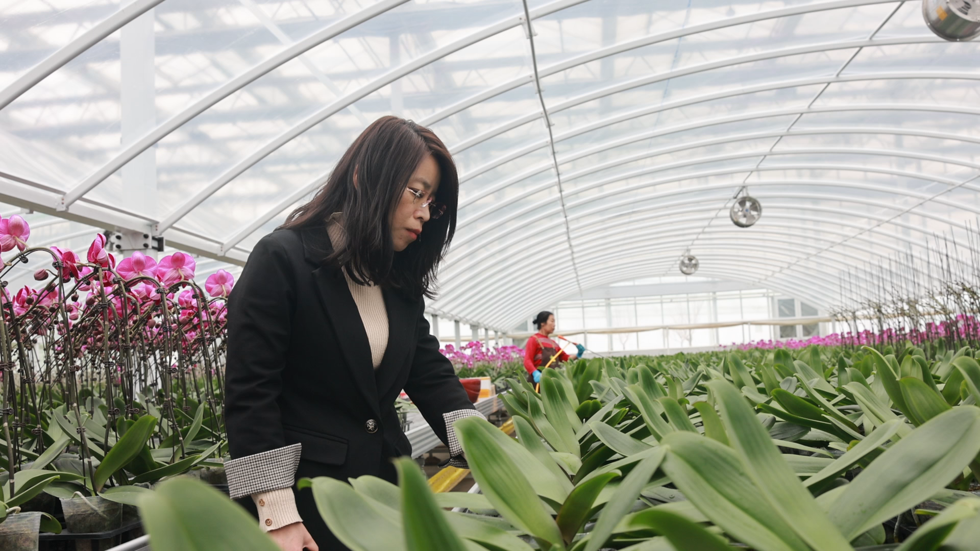 陈静正在察看蝴蝶兰的长势(央广网发 丁伊雯 摄)