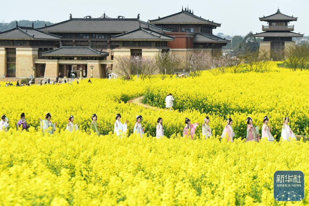 ↑ 3月23日,汉服爱好者在成都市双流区“瞿上田园”景区游玩。新华社发(李向雨摄)