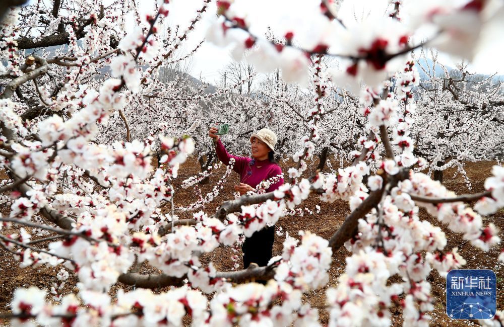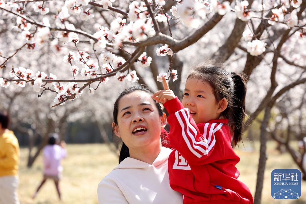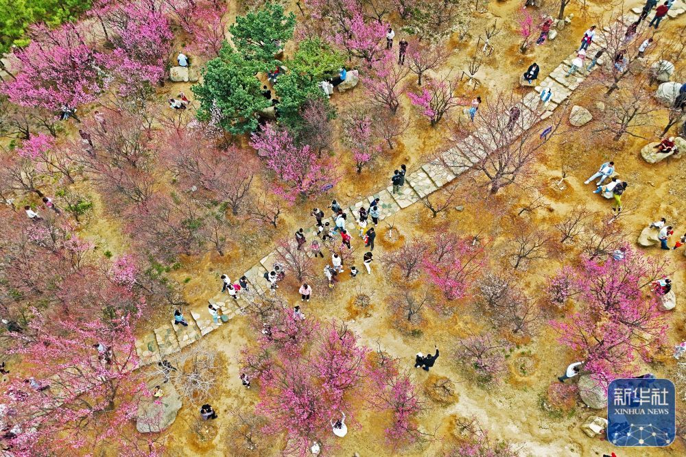 ↑ 3月23日,游人在山东省枣庄市山亭区山城街道老朴山村杏园游玩。新华社发(张强摄)