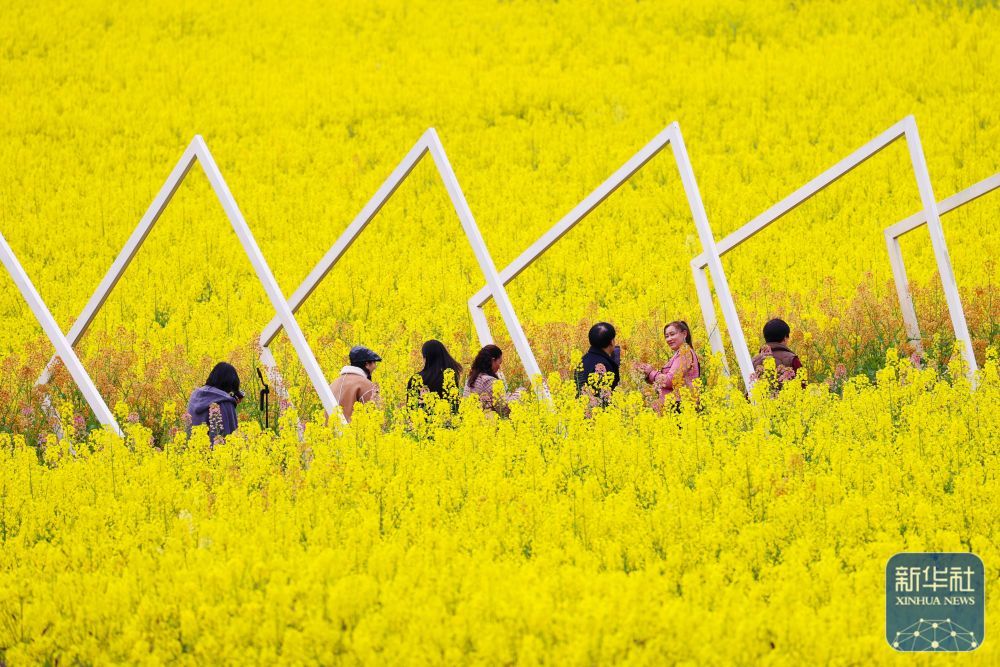 ↑ 3月23日,在重庆市黔江区与湖北省咸丰县大路坝区联合举办的渝鄂边区第三届油菜花旅游观光活动现场,游人在油菜花田游玩。新华社发(杨敏摄)