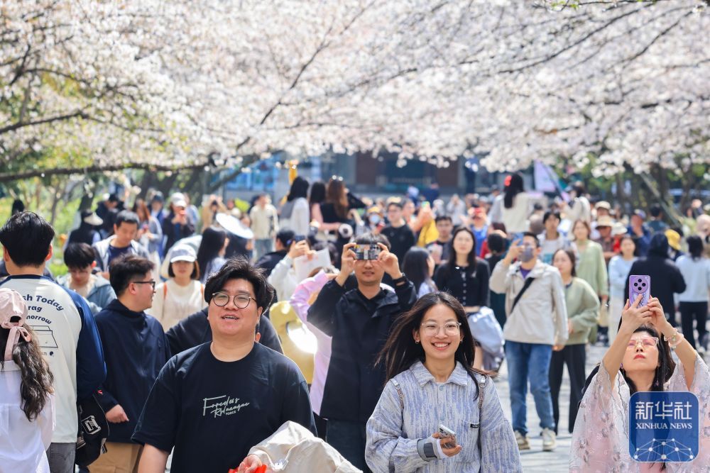 ↑ 3月24日,人们在南京林业大学校园里观赏樱花。新华社发(苏阳 摄)