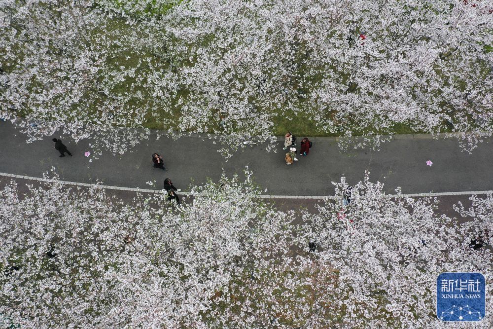 ↑ 3月23日,游人在四川省眉山市东坡文创园樱花大道赏花游玩(无人机照片)。新华社发(姚永亮摄)