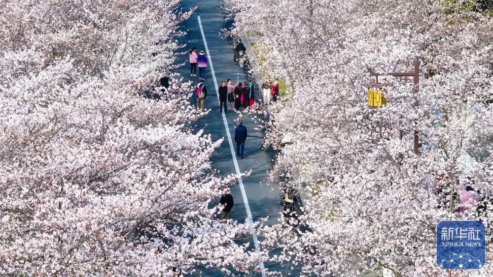 ↑ 3月24日,游人在江苏扬州鉴真路“樱花大道”上踏春赏樱(无人机照片)。新华社发(齐立广摄)