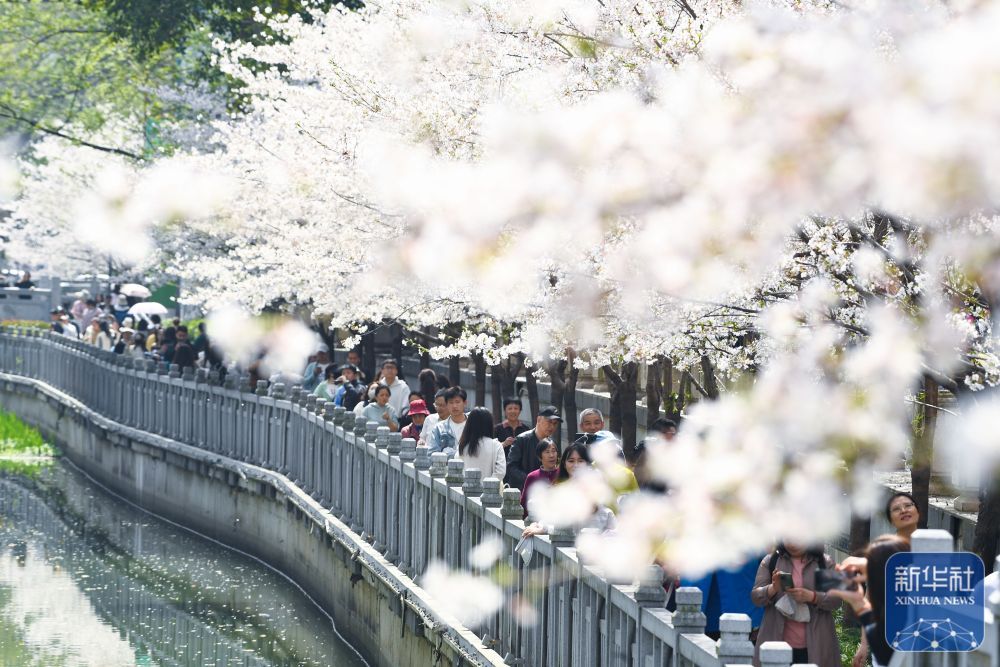 ↑ 3月24日,游人在南京珍珠河畔赏樱游玩。新华社发(杨素平摄)