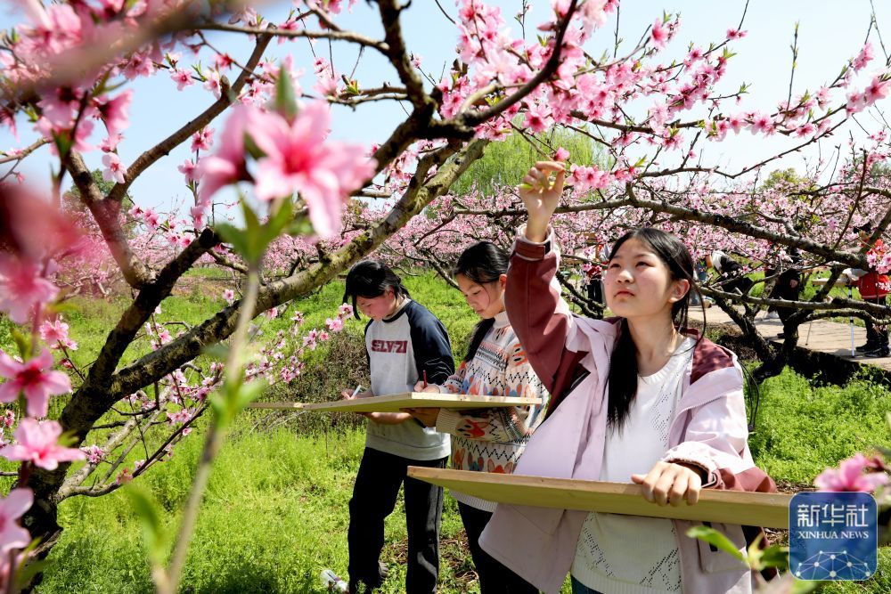 ↑ 3月24日,在四川省广安市广安区龙安乡大云山桃树园,参加研学旅行的学生在写生。新华社发(廖小兵摄)