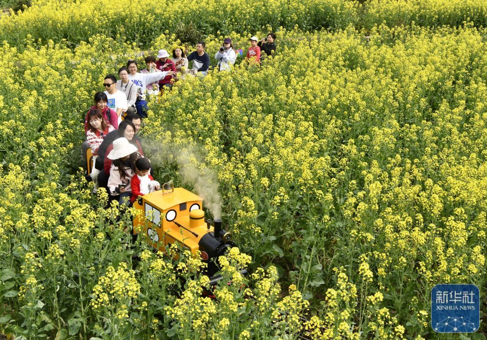 ↑ 3月23日,游人在江西省上饶市婺源县江岭景区乘坐蒸汽小火车在油菜花海中穿行。新华社发(李宗宪摄)