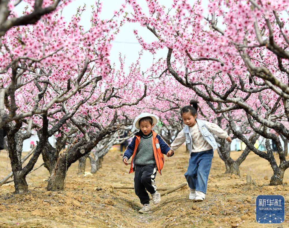 ↑ 3月23日,在安徽省巢湖市烔炀镇岐阳村桃园,两个小朋友在桃树下奔跑。新华社发(马丰成摄)