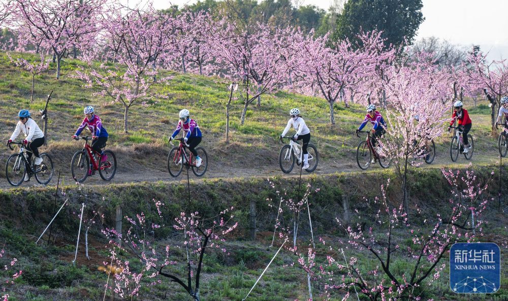 ↑ 3月23日,骑行爱好者在安徽省芜湖市繁昌区平铺镇桃花园里骑行。新华社发(肖本祥摄)