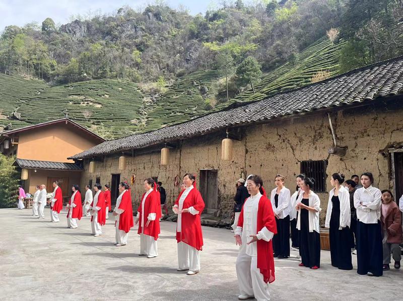 活动在茶园山水间搭建舞台,以茶艺与古筝合奏拉开序幕,伴随《灵动的山野》《瑜你相伴》《红梅赞》等瑜伽、舞蹈、太极节目轮番上演,将运动之美与自然生态相映成趣。百余名表演者在茶园、木桥、溪涧等场景中沉浸式展演,形成“人在画中舞,画随人灵动”的独特景观。