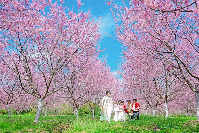 孩子们在龙山千亩樱花园进行踏青研学活动。图片来源:视觉中国