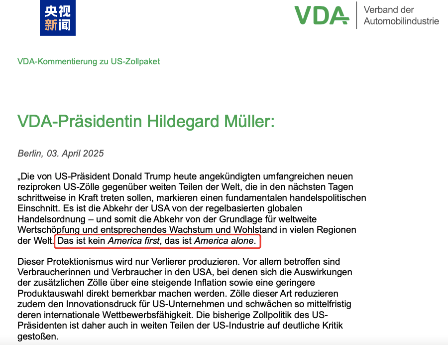 德国汽车工业协会主席希尔德加德·穆勒在4月3日发表的声明中批评称,美国对汽车行业征收25%的额外关税是对全球供应链的严重打击,可能对德国汽车企业及其在美投资带来不确定性。她直言:“特朗普的政策不是‘美国优先’,而是‘美国孤立’。这种保护主义做法只会带来更多输家,最终受影响的将是美国消费者、企业乃至全球经济。”