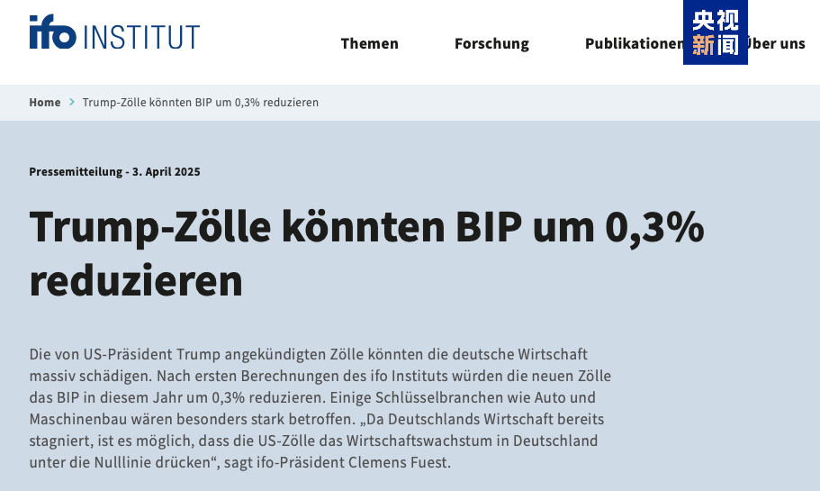 根据德国智库伊弗经济研究所4月3日发布的初步测算,美国的新关税政策可能导致德国今年的国内生产总值下降0.3%。汽车和机械制造等关键行业将受到尤为严重的影响。该研究所所长克莱门斯·菲斯特警告称:“由于德国经济已经停滞,美国的新关税可能会使德国的经济增长跌破零。”