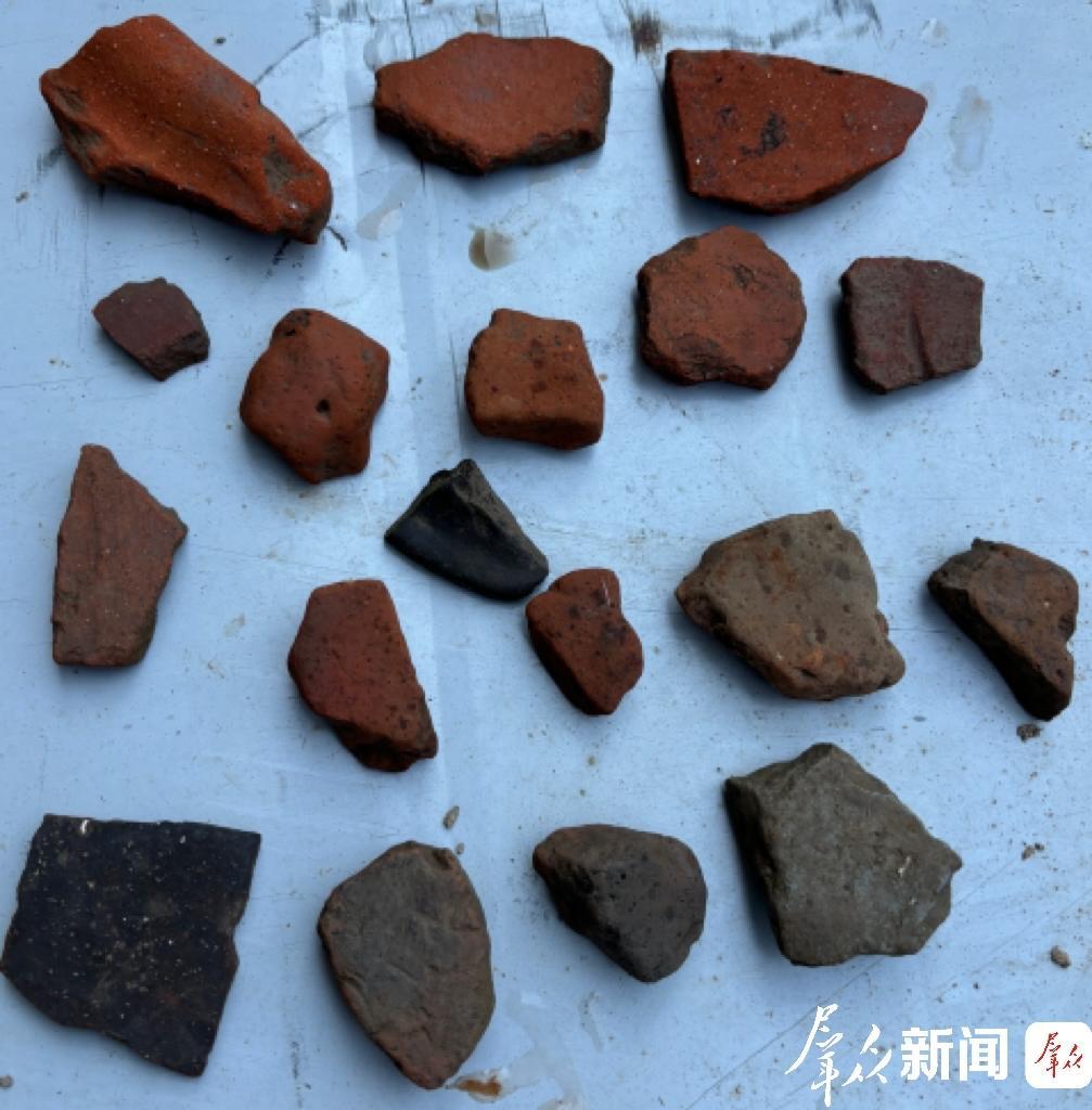 普查队员详细调查后发现,遗址分布范围呈不规则弧形,面积约8300平方米。普查队负责人介绍,现场采集的陶片以夹砂红陶片、夹砂红陶块为主,少量夹砂灰陶,其中有夹砂红陶器物口沿残片2件、夹砂灰陶器物口沿残片1件,不过现场未发现彩陶、石器、骨器等。结合遗址地理环境和出土遗存分析,其可能为一处新石器时代聚落遗址。