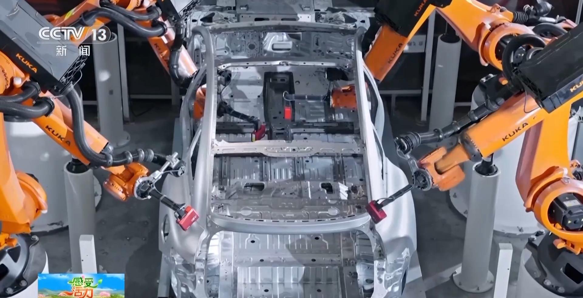 超级工厂制造部副部长 张东臣:我们整个冲压是通过6700吨的冲压机,每个零件从生产到完成是3.75秒,也就是说一分钟可以生产16个部件。焊装的主线全自动化率100%,现在是两分钟下线一台车身。这条生产线有527个机器人在同步作业,搬运、涂胶、焊接、铆接、检测,机械手臂无处不在。