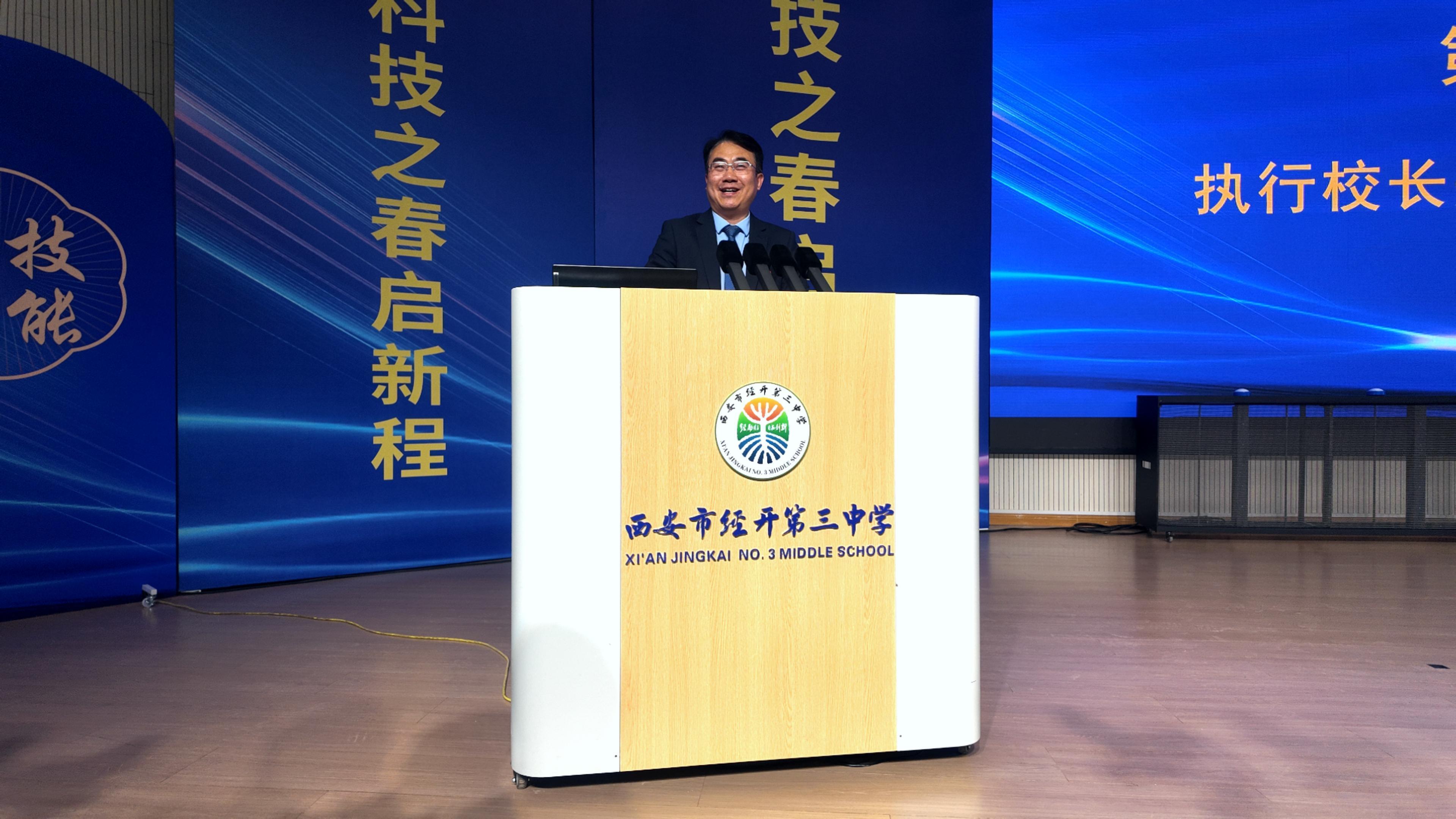 启动仪式上,陕西省西安中学副校长、经开三中执行校长郑宏宝致欢迎辞,对各位领导、嘉宾的到来表示欢迎,并感谢他们对学校科学教育工作的支持与指导。西安经开区教育管理发展中心副主任郭星宇在讲话中强调,教育、科技、人才是全面建设社会主义现代化国家的基础性、战略性支撑,经开区将坚定不移地支持科学教育事业的发展,为培养更多优秀人才贡献力量。西安市科协副主席杨玉芹也发表了讲话,她强调科学教育是培养青少年创新精神和实践能力的关键所在,市科协将积极整合各方资源,为经开三中的科学教育提供有力支持。