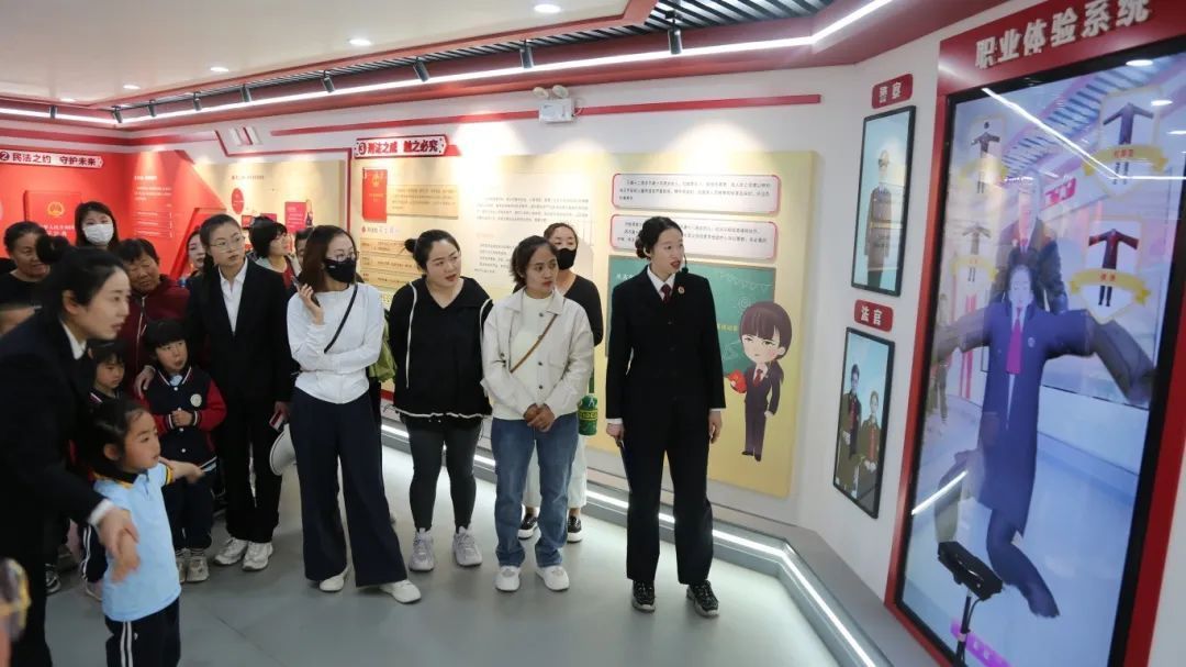 活动中,在检察官的引导下,家长和孩子们有序参观法治教育基地。职业换装体验区,孩子们身着法袍、警服等服装,沉浸式体验法律职业魅力;模拟法庭内,逼真的庭审场景设置、专业的法律流程演示,让参观者直观感受法律威严;法治文化长廊中,图文并茂的案例展示与互动问答,潜移默化中播撒法治种子,帮助未成年人初步树立法治观念,也让家长深刻认识到家庭在法治启蒙教育中的关键作用。