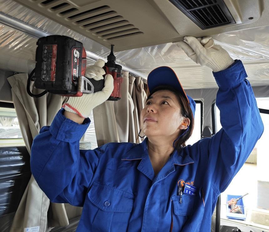 在装配某车型的车时,她发现由于按钮开关和点火钥匙开关装配空间狭小,装配完毕后,经常会出现开关松动或拧不紧的现象。为了解决这一难题,她带领团队反复试验,最终设计出专用拧紧工具,将故障率从40%降至1%以下。