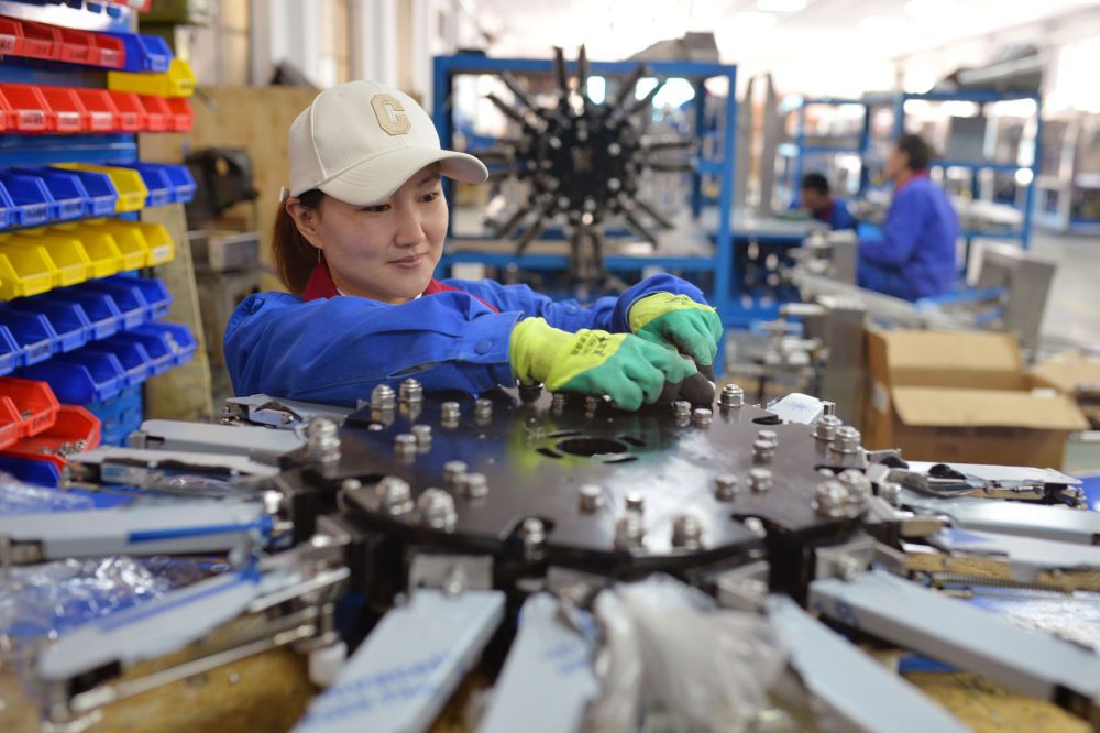 3月30日,在山东省青岛市城阳区夏庄街道青岛义龙装备制造股份有限公司生产车间内,工人在组装包装机。新华社发(王海滨摄)