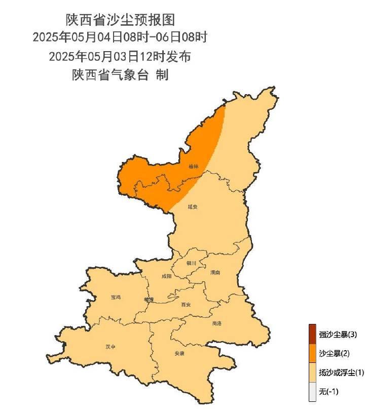 预计5月4日至5日,受冷空气影响,全省将出现大风、沙尘天气过程。4日至5日陕北、关中大部、秦岭山区、商洛有5级左右(5.5~10.7m/s)偏北风,阵风7-9级(13.9~24.4m/s),局地可达10级(24.5~28.4m/s)以上,全省伴有扬沙或浮尘天气。