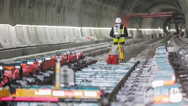 5月13日,西康高铁秦岭九天山隧道顺利贯通。图为技术人员在隧道内的无砟轨道作业现场进行测量。 群众新闻记者 许奥博摄