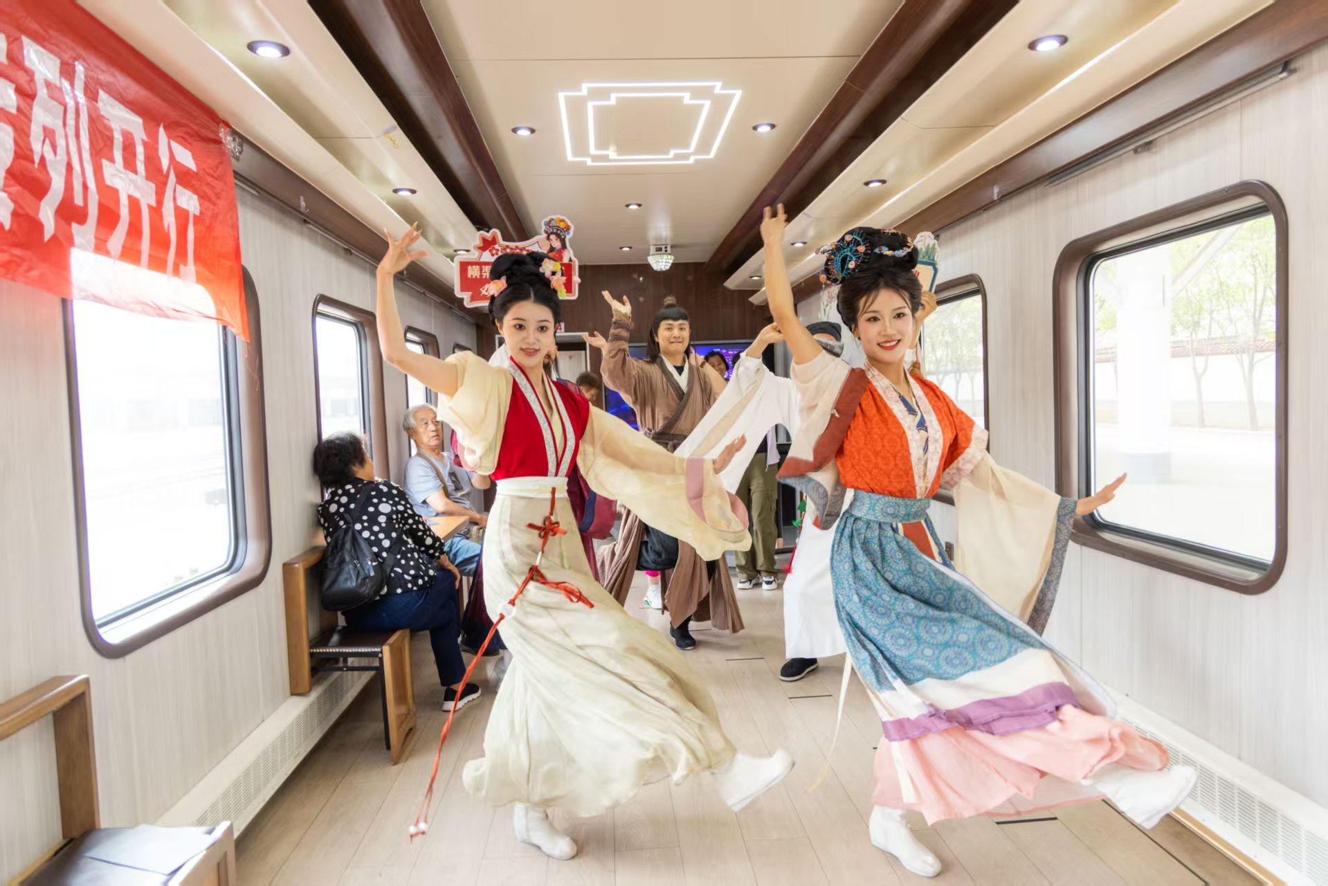 首发旅游专列车厢在展陈设计上突出“一车厢一主题”的特色,全面融入了周秦文化元素与宝鸡的非遗、人文资源。列车运行期间,宝鸡文旅宣传推介活动精彩丰富、贯穿全程,游客不仅能现场体验西秦刺绣的精美制作,还能品尝擀面皮、马蹄酥等西府美食,近距离欣赏非遗传承人技艺表演,真正实现了“人在途中、景在窗外、文化在身边”的沉浸式体验。同时,专列还配备了移动KTV与观景休闲区,让游客在旅途中感受多元文化魅力。专列停靠扶风县、眉县、岐山县、千阳县、陇县期间,各县区结合自身文化特色,开展了差异化迎宾活动和旅游咨询服务。