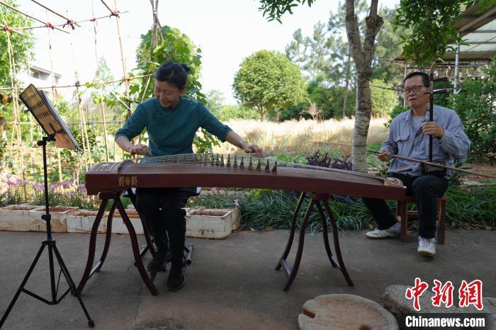 900余平方米后院内,枇杷、桃、葡萄、板栗等10余种果树绿意葱茏,西红柿、辣椒、黄瓜等应季蔬菜长势正旺。置身其间,台胞苏原庆与伴侣刘保芳,分执二胡、古筝,合奏《渔舟唱晚》。