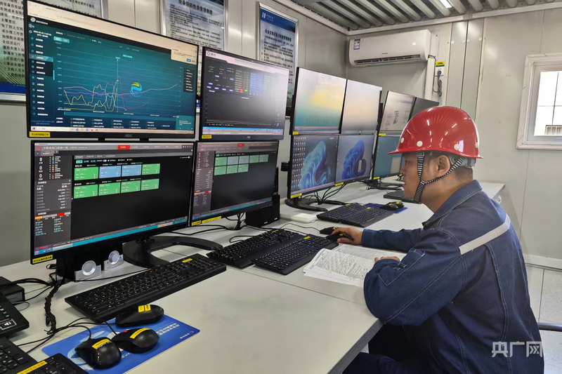 华能塔城地区托里县50万千瓦风电项目人员在查看后台 (央广网发 马晓杉 摄)