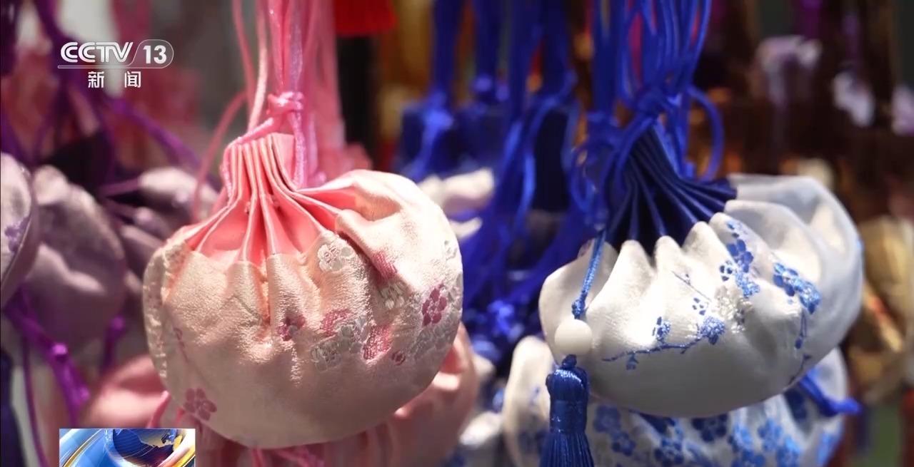 除了粽子,很多地方还有选购香包的习俗。在河南南阳,琳琅满目、寓意健康吉祥的手工香包受到消费者的喜爱。