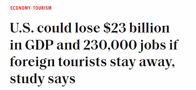 经济分析公司Implan首席经济学家珍妮弗·索瓦尔德森(Jennifer Thorvaldson)测算称,基于3月份外国游客赴美人数下降的情况,若今年国际游客减少10%,不仅美国国内生产总值(GDP)将损失230亿美元,还会损失大约23万个工作岗位。