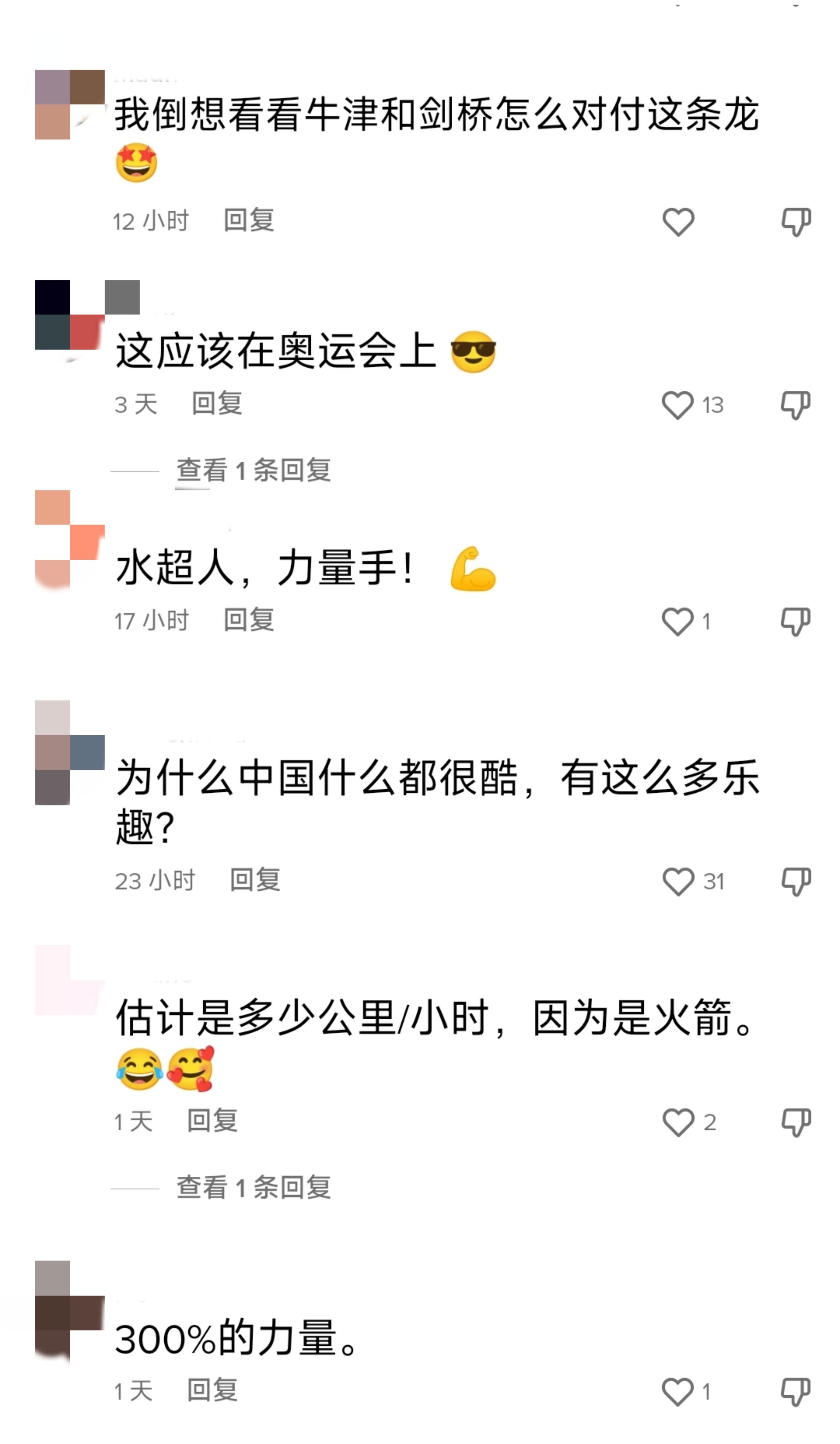 惊叹其“火箭速度”之余,更有外国网友向牛津剑桥赛艇队发起挑战:你们要怎么对付这条“龙”?