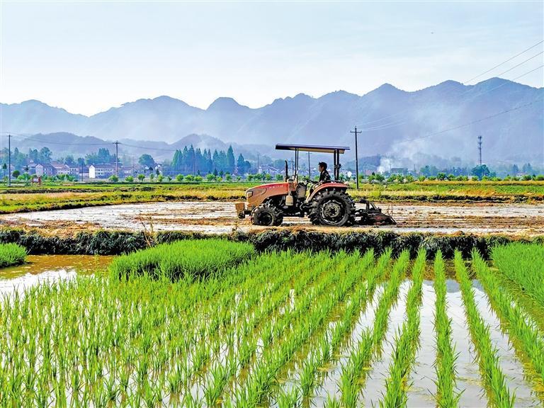 5月28日,勉县阜川镇水田里,农机手驾驶农机平整水田。 通讯员 杨文忠摄