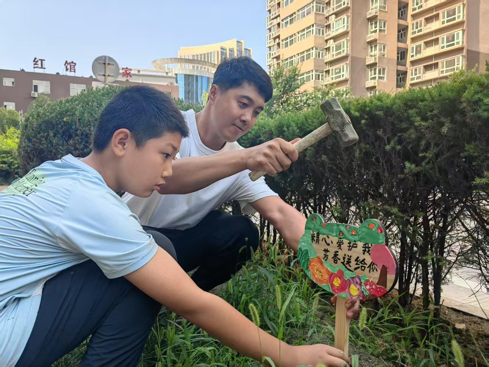 在府谷县阳光社区的绿化带和广场上,“精心爱护我 芳香送给你”的提示牌在孩子和家长“叮叮当当”的敲打声中,插在了草坪上。这个“不起眼”的爱绿护绿倡议,源自该社区“谷多多”儿童议事会“共育行动家”行动。