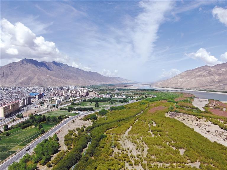 雅江中游“百里绿色生态长廊”与日新月异的山南市区和谐共生,展现出高原独有的生态之美(无人机照片)。记者 武沛涛 摄