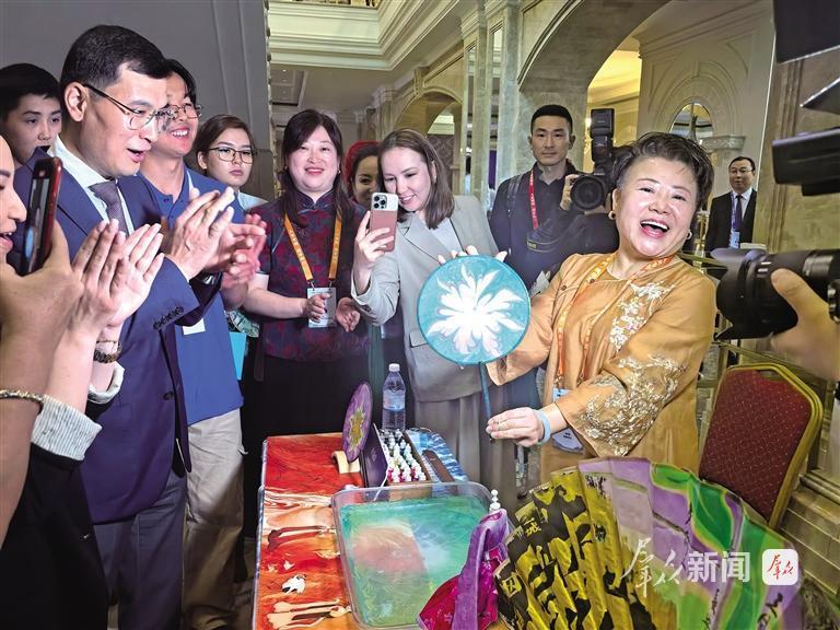 人文交流集市上,陕西客人与当地民众面对面的交流留下了一个个令人感动和印象深刻的瞬间:当纸扇从带颜料的水中取出,一朵艳丽的花在扇面上绽放时,唐流彩的如梦似幻引来阵阵赞叹;缠花手艺人孙莹针线飞舞,一个个漂亮的缠花作品逐渐成形,引来好奇的人们围观;涂上秦腔脸谱的艺人陈耀武成为人群中的“显眼包”,人们争相和他合影留念……西安市群众艺术馆、西安市非遗保护中心选送的唐流彩、西安剪纸、缠花、关中秦腔戏剧脸谱、华山戏法等10项非物质文化遗产代表性项目在集市上大放异彩,让当地群众真切感受到中国文化的博大精深。