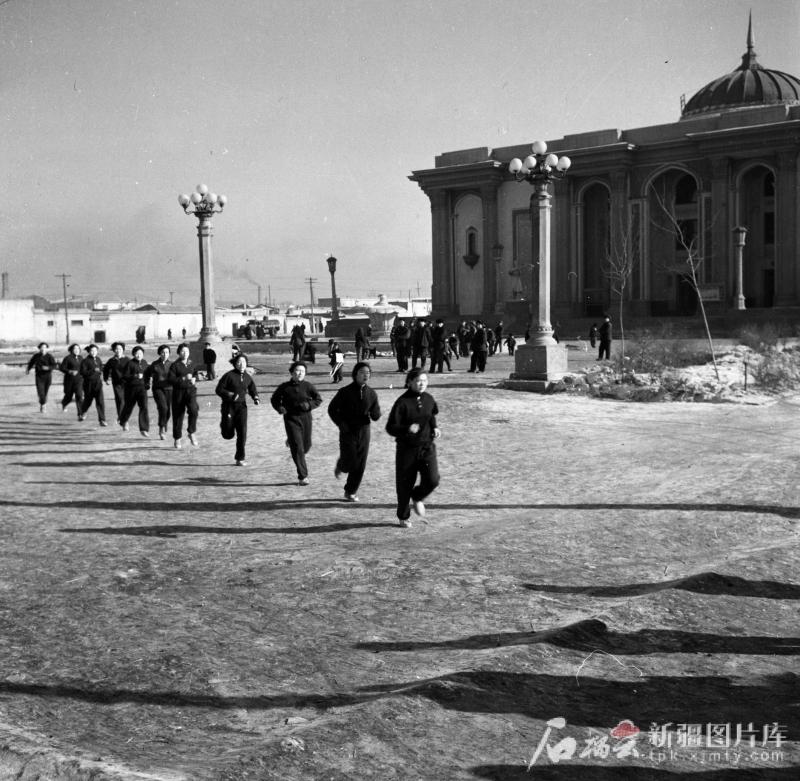 这张拍摄于1964年3月的照片,记录了当时新疆女篮姑娘们在位于乌鲁木齐市南门附近的新疆人民剧场外长跑训练的场景。照片里,剧场巍然矗立,门前的喷水池、雕塑依稀可辨,而剧场北侧曾经的一排排平房,如今已变成了车水马龙的人民路,路边高楼鳞次栉比。