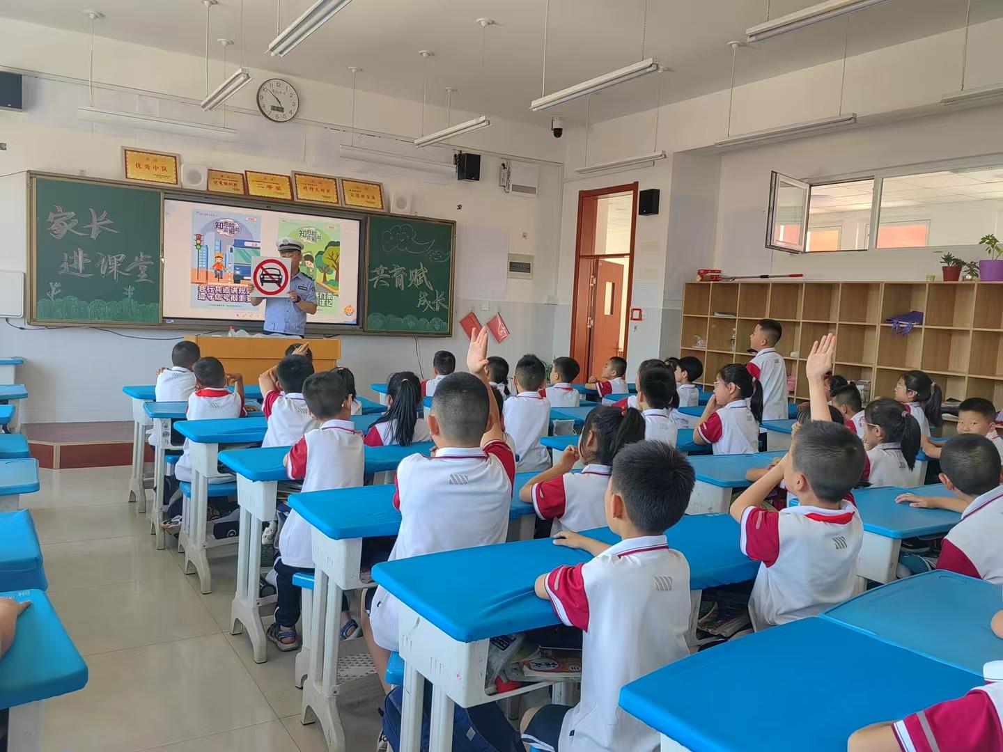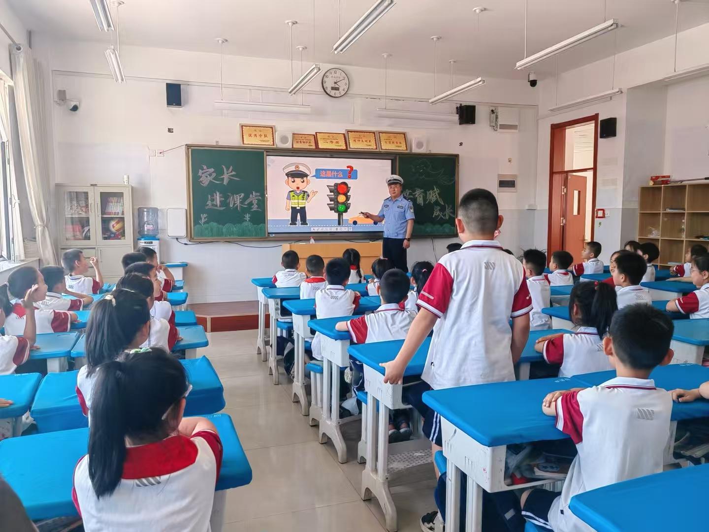 活动现场,身为警官的赵亦墨爸爸化身“安全讲师”,为学生们带来了一场生动有趣的交通安全知识讲座。他结合小学生的认知特点,用通俗易懂的语言和生动形象的动画视频,详细讲解了安全过马路、识别交通信号灯和交通标志、乘坐交通工具的注意事项等内容。引导孩子们争做“小小交通文明监督员”。在互动环节,孩子们积极踊跃参与,准确回答出民警提出的各类交通安全问题,现场气氛十分活跃。