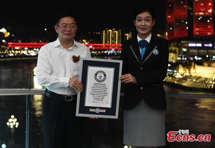 A drone light show held at Nanan District, southwest China’s Chongqing, receives a Guinness World Record certificate, June 17, 2025