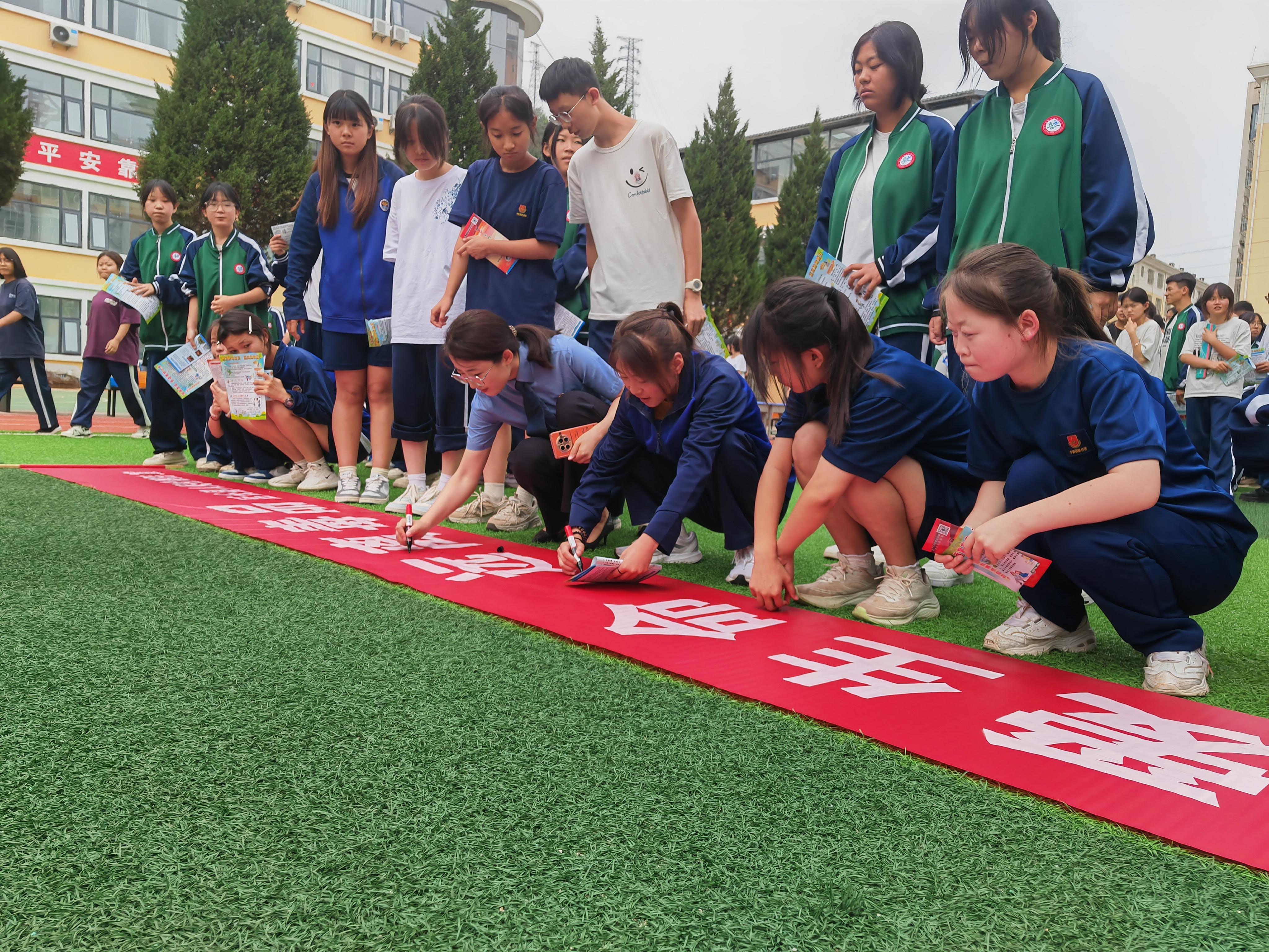 法治课堂结束后,在检察官和警官的带领下,全体师生高举右拳,庄严宣誓:“远离毒品,珍爱生命,争做新时代健康青少年!”铮铮誓言在校园上空久久回荡,展现出师生们坚决抵制毒品的坚定决心。宣誓完毕,大家有序在禁毒横幅上郑重签名,用实际行动许下抵制毒品的承诺。