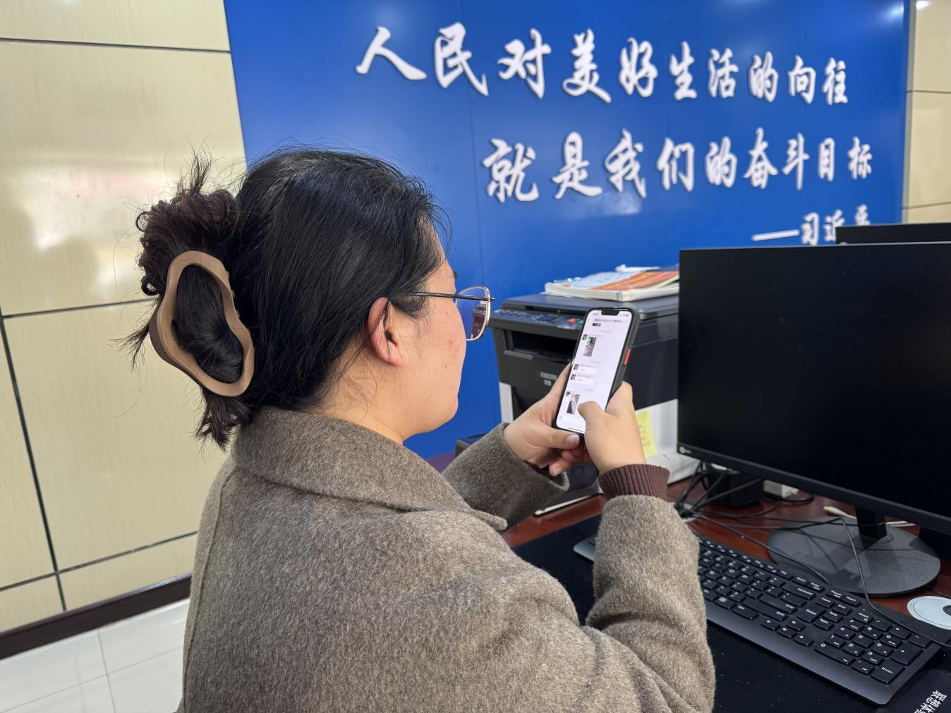 苗家坪镇颐和社区党支部书记续慧打开“五级五长”微信交流群,查看村内群众在群内提出的问题和工作信息