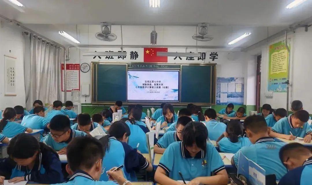 为了使学生掌握基本数学知识与基本技能,培养学生的逻辑思维能力、运算能力、空间观念,让学生逐步学会正确、合理地进行运算并逐步培养其观察、分析、综合、概括与动手的能力。6月26日,延安市宝塔区第七中学组织七年级学生举办了“诚勤铸基,智算未来”——计算能力竞赛活动。竞赛过程中,全体同学认真答题,数学组的各位老师监考认真,阅卷仔细,竞赛环节有序。