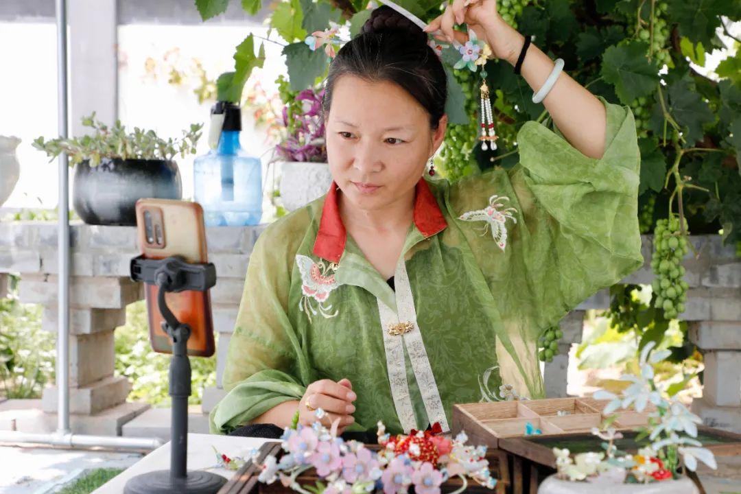 走进鱼河峁镇岔上村村民叶华家,只见她正坐在干净雅致的庭院里开启直播,向屏幕另一端的网友展示亲手制作的发簪、发冠、琉璃配饰等精美工艺品。身后,藤蔓缠绕的葡萄架下挂满饱满的果实,古色古香的院落布景与手工艺品相映成趣。自家房屋改造成“小院作坊”,闲置空间成了创作与展销的阵地,一双巧手制作的手工艺品成了家庭增收的“新引擎”,让她的日子过得既充实又红火。
