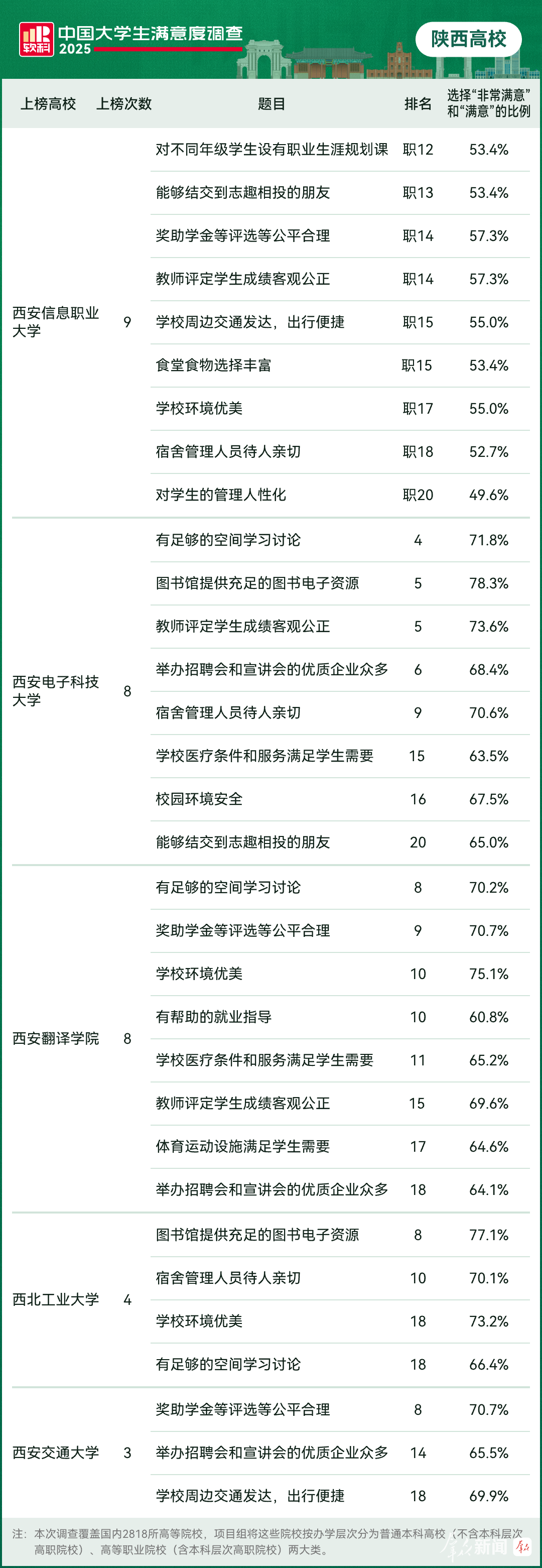 今年的软科中国大学生满意度调查中,陕西共有5所高校上榜。其中,4所为普通本科高校(不含本科层次高职院校),1所为高等职业院校(含本科层次高职院校)。