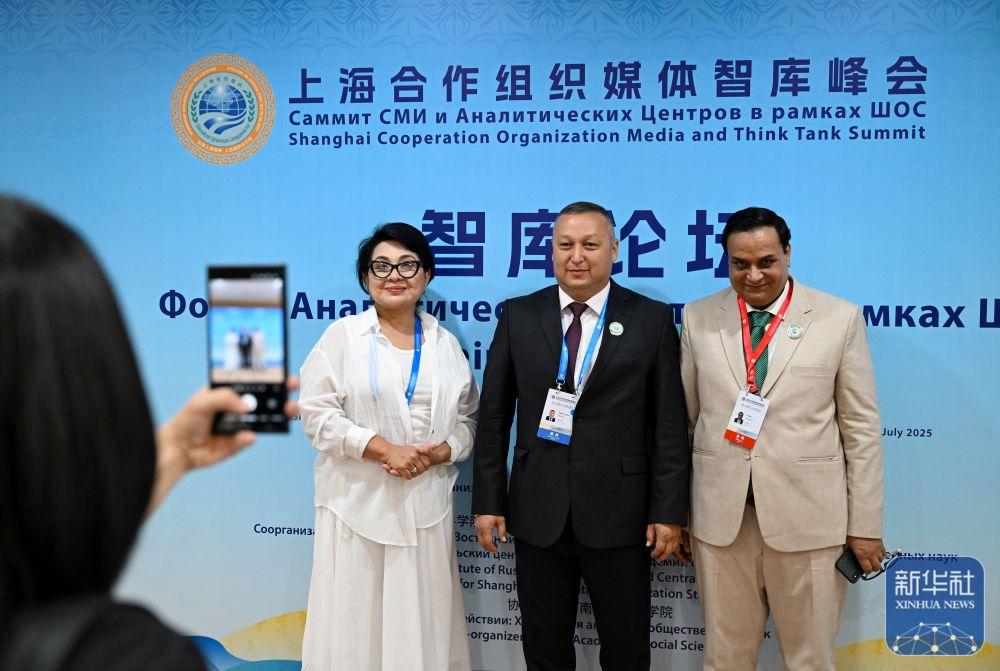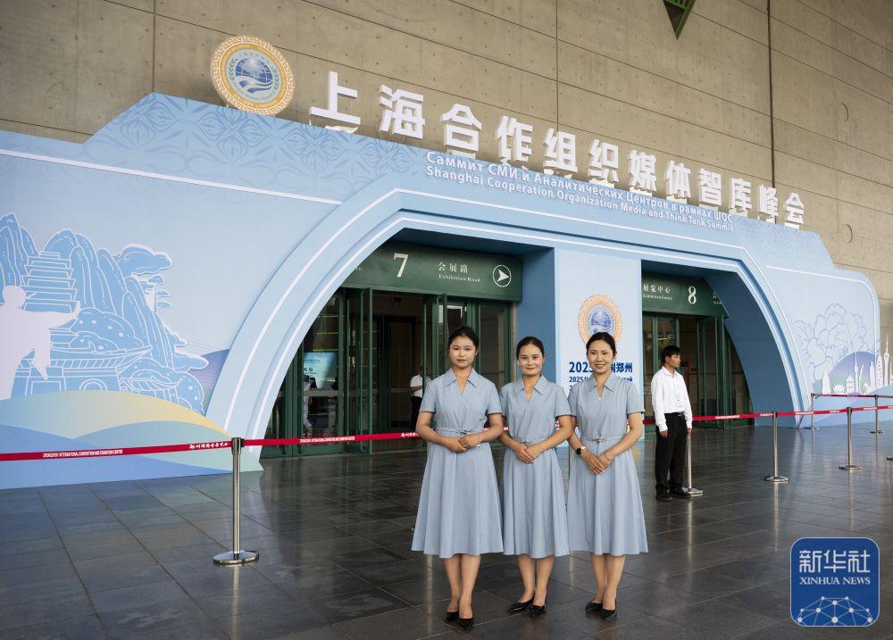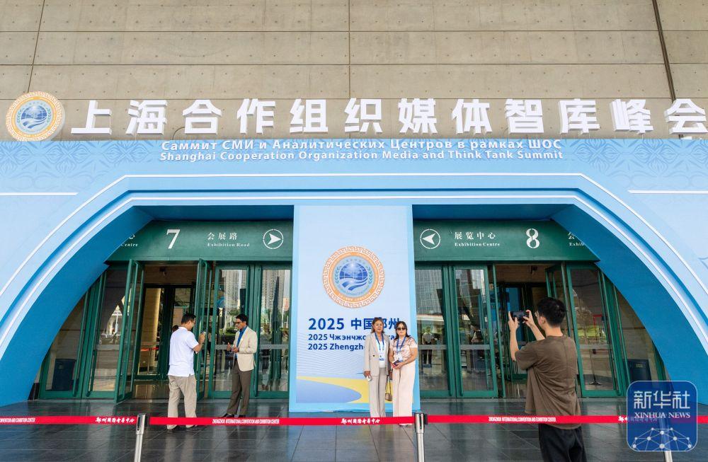 ↑ 7月24日,在河南郑州举行的上海合作组织媒体智库峰会会场外,与会代表合影留念。新华社记者 伍婧丹 摄上海合作组织媒体智库峰会于7月23日至27日在河南郑州举行。峰会主题为“弘扬‘上海精神’,共建美好家园”。来自上海合作组织26个国家的156家主流媒体、知名智库、政府机构以及联合国、上海合作组织秘书处等国际和地区组织的400多名代表参会。