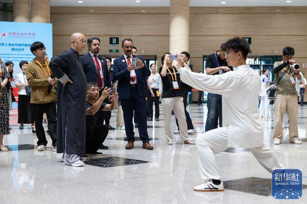 ↑ 7月24日,在河南郑州举行的上海合作组织媒体智库峰会会场,与会代表观看太极拳表演。新华社记者 白雪骐 摄