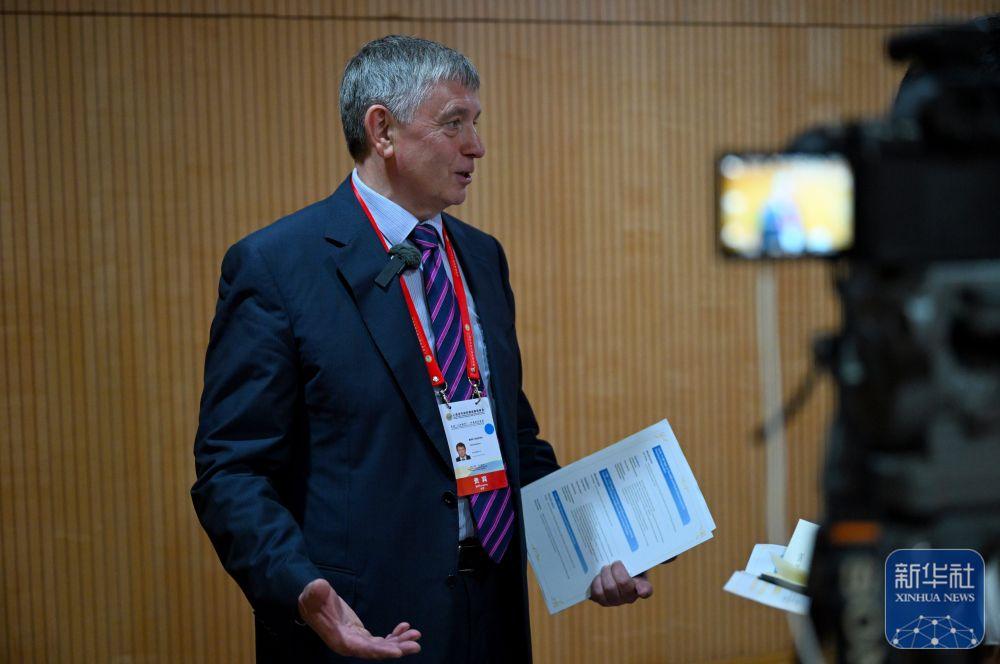 ↑ 7月24日,在河南郑州举行的上海合作组织媒体智库峰会会场,与会代表接受媒体采访。新华社记者 郝源 摄