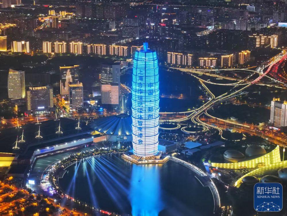 ↑ 7月23日晚,郑州国际会展中心旁的千玺广场主楼亮灯宣传上海合作组织媒体智库峰会(无人机照片)。郑州国际会展中心是峰会举办地。新华社发(付锐 摄)
