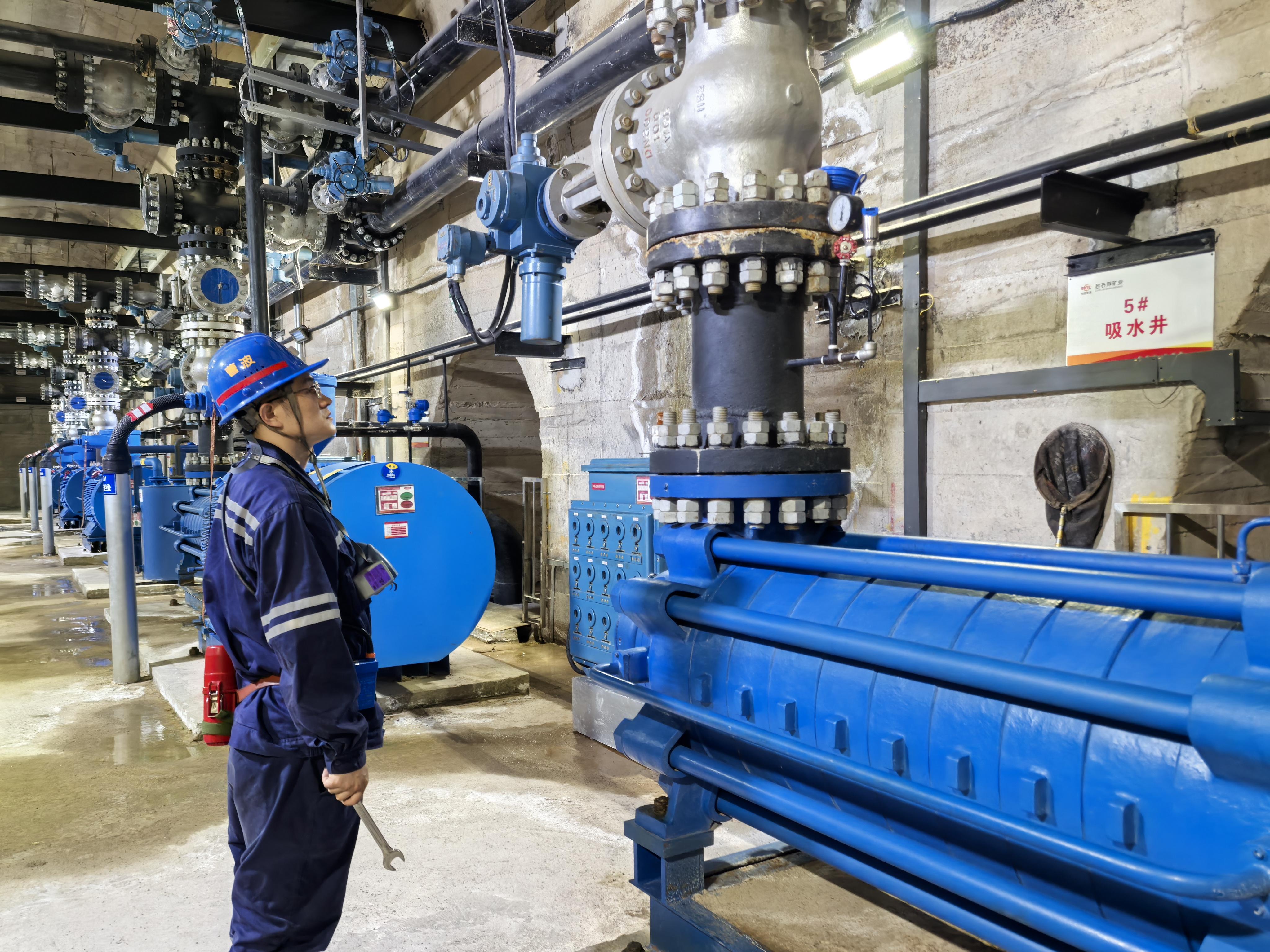 水泵房轰鸣作响,阀门压力表指针稳稳停在5兆帕。值班水泵工屏息凝神,开启排水阀门,确保井下水仓水位始终低于警戒线。“多排一方水,井下就多一分安全。”他们说。