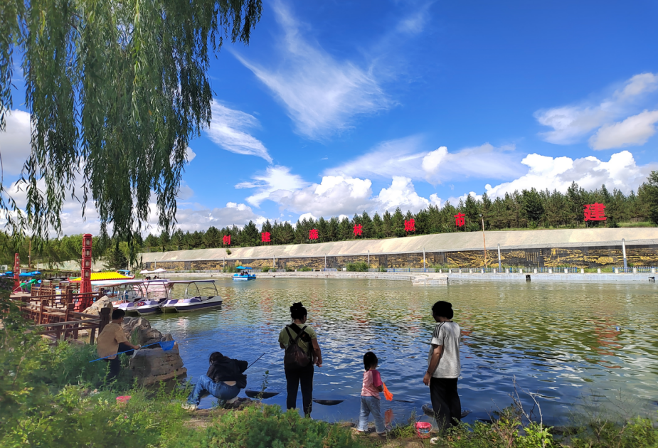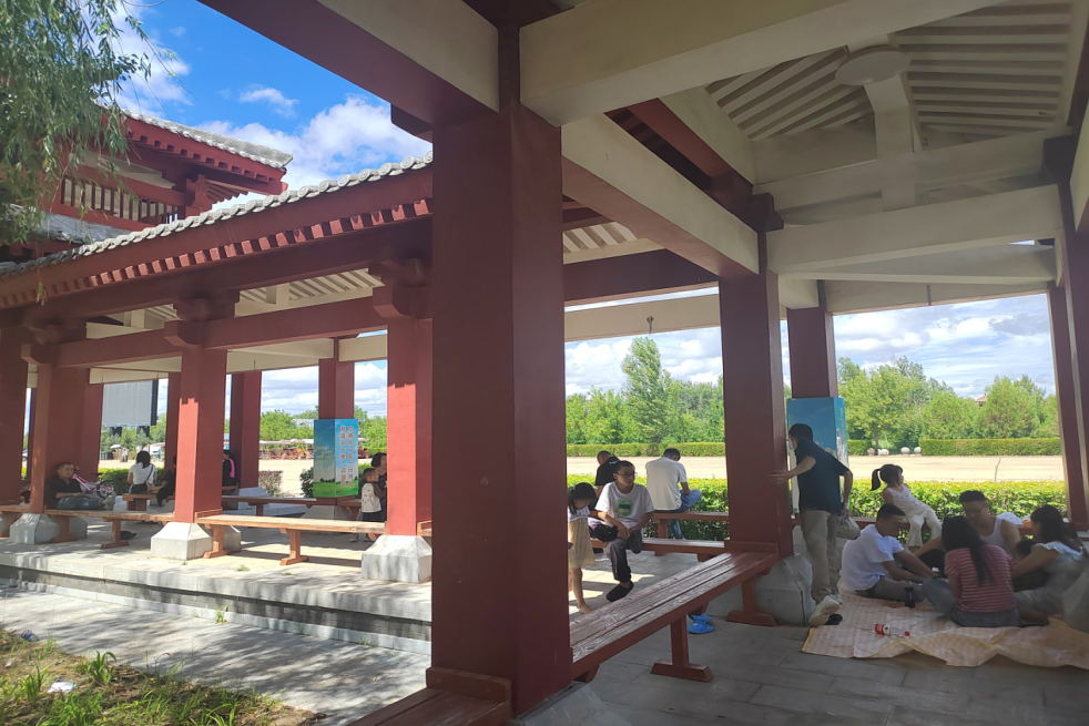 风雨长廊里,是另一番热闹的场景。三五成群的游客坐在长廊椅上,或嘻嘻哈哈地诉说着欢乐,或倚靠在廊柱上闭目养神,或捧着雪糕品着独属的清凉。更有甚者,干脆铺开黄色格子野餐垫,围坐一圈打牌消遣。得月湖边,垂柳依依,这里是亲子共同捞鱼的欢乐场景,清风拂过,湖面荡起一圈圈的涟漪,数只小船载着游客晃悠着,尽显悠闲自在。